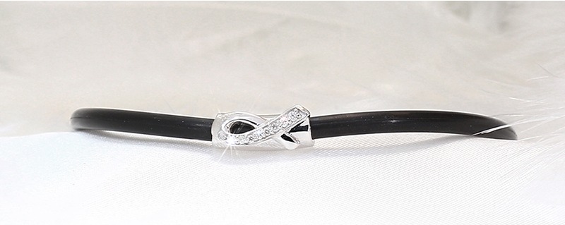A sleek, modern option with unisex appeal. Featuring a soft black neoprene band and a polished sterling silver White Ribbon charm set with eight white diamonds.